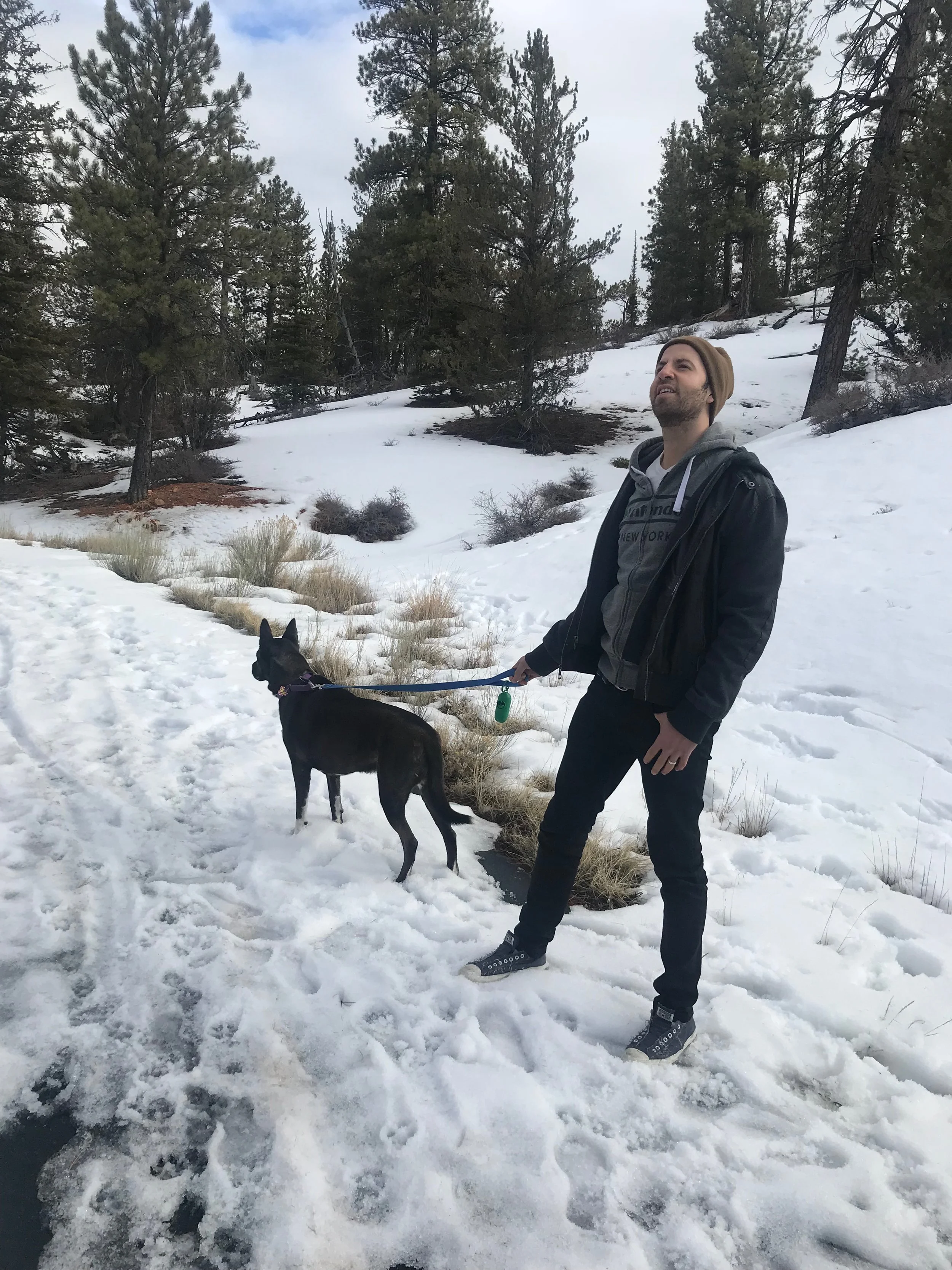 It's Baxie's first time in the snow --LOOK! At what? I don't know, but we're both looking at something.